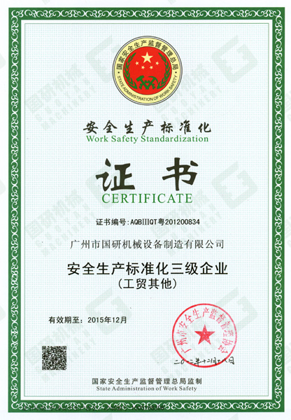 2012年12月24日,国家安全生产监督管理总局为国研机械公司颁发了《安全生产标准化企业证书》,这意味着我司已达到《广州市工业企业安全生产标准化评定办法》及《广州市工业企业安全生产标准化评定标准》的要求。